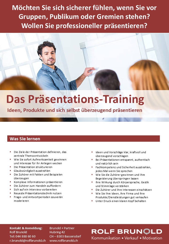 Rolf Brunold liefert seit über 25 Jahren wirksame Werkzeuge, um ihren Standpunkt erfolgreich klar zu machen. Dieses Training befähigt Sie, Mitarbeiter und Geschäftsleute, vor jedem Gremium und egal unter welchen Bedingungen zuversichtlich und überzeugend zu kommunizieren. Es vermittelt Ihnen die Fähigkeiten und Strategien, um Ihre Themen erfolgreich anzugehen, das Vertrauen jeder Zuhörerschaft zu gewinnen und starke Botschaften zu präsentieren. Das Training hilft Ihnen, neues Wachstum zu erzeugen.